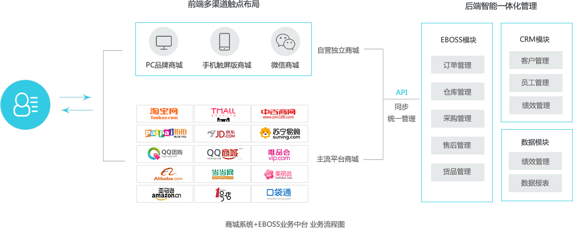 应用范围广,流程清晰,操作简便,界面友好,系统稳定的业务中台EBOSS。功能上囊括了多平台多店铺管理、商品管理、订单处理、采购管理、发货管理、售后管理、库存管理、财务账款、会员管理、报表中心等主要模块。