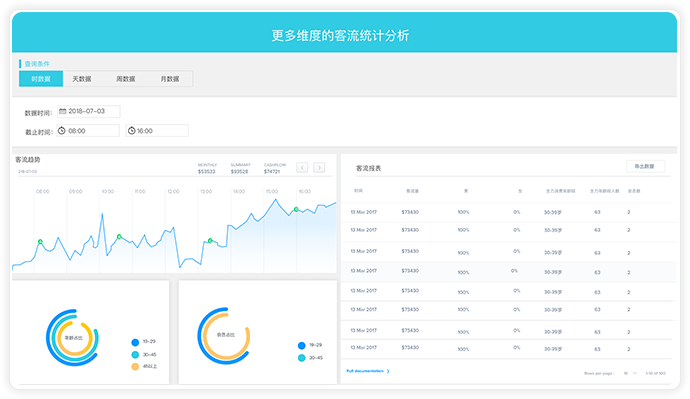 可显示客流量、营业额、成交量、客单价、会员到店数、