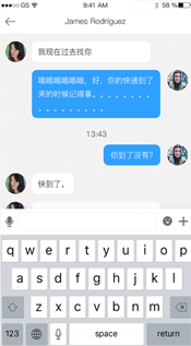 基础功能,文字、图片、表情、语言、文件等,可基于通讯录原有用户及好友关系进行通讯,满足用户间的即时沟通.