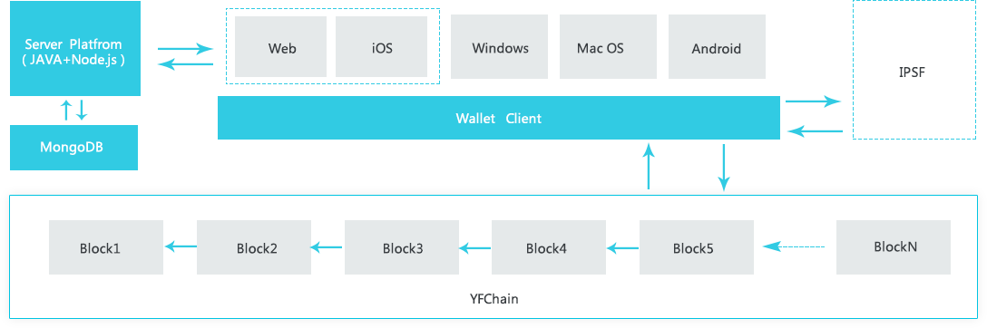 远丰区块链+生态联盟系统由数字通证(Token)、区块链、数字钱包、生态平台构成