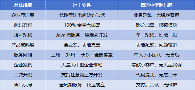 当前市场上电商源码提供商众多,但质量参差不齐,通过对比可以清晰看出远丰软件的核心优势: